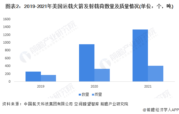 2019-2021年,美国运载火箭发射载荷数量、质量规模快速增长,三年间载荷数量复合增速达到130%,载荷质量复合增速达到56%。2021年运载火箭发射载荷数量达到1335个。载荷质量达到403.34吨。