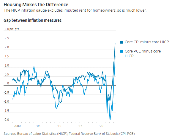 主要原因是欧洲的HICP指标不包括房主“假想”的租房成本,而这部分成本约占美国核心CPI的三分之一。这个分项被称为“业主等效租金”或估算租金,长期以来一直受到批评。