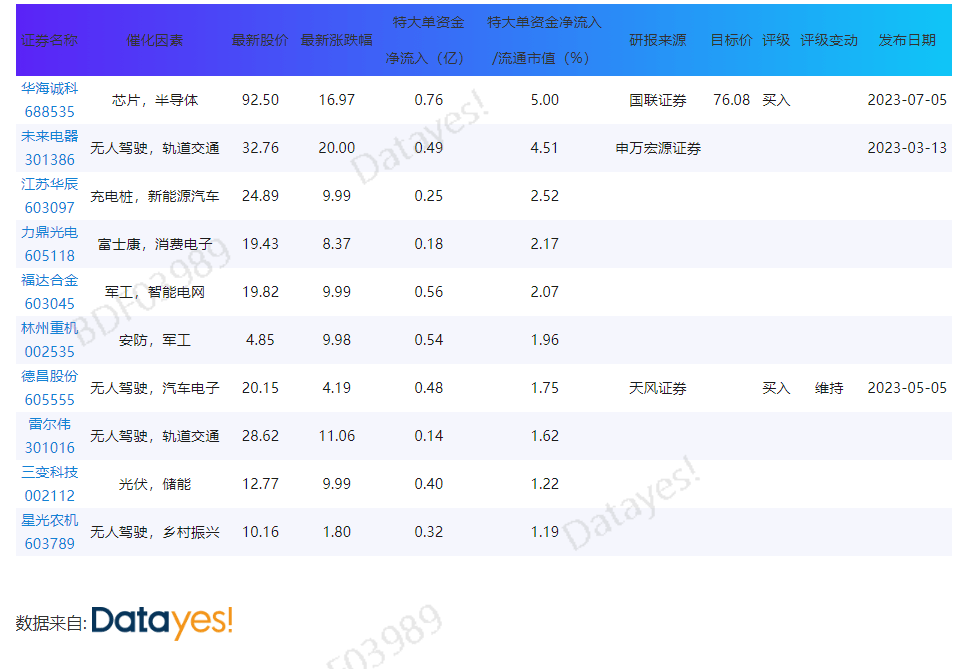 我们按照特大单资金的净流入/流通市值从大到小排序,列出了净流入/流通市值最大的10只股票。注,如个股没有明显的催化因素,可适当关注其中隐藏的逻辑预期差: