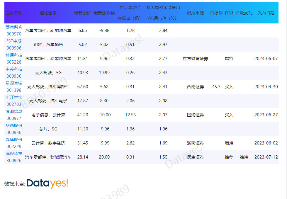 同样地,我们按照特大单资金的净流出/流通市值从大到小排序,列出了净流出/流通市值最大的10只股票: