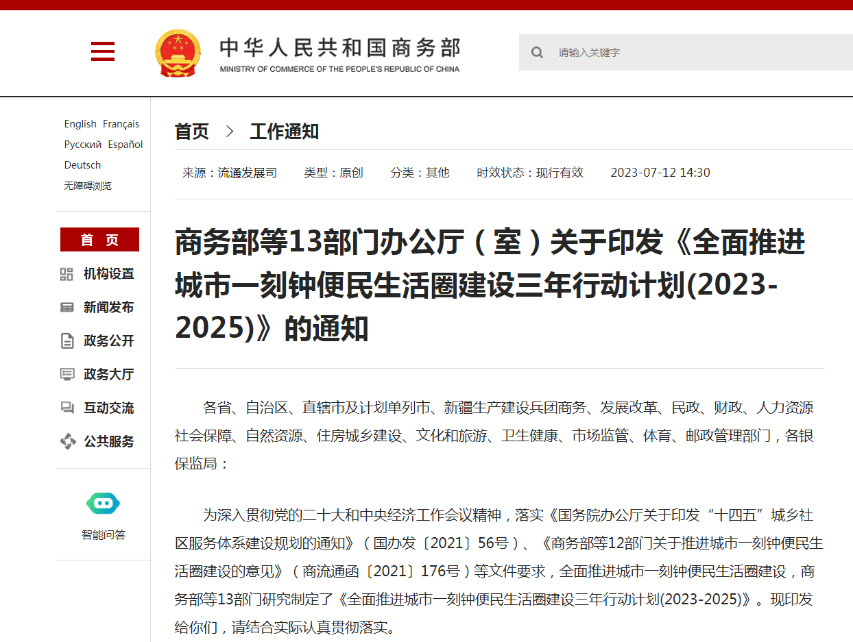 7月12日,商务部等13部门办公厅(室)发布关于印发《全面推进城市一刻钟便民生活圈建设三年行动计划(2023-2025)》的通知。