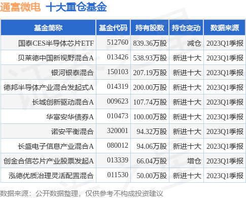 根据2023Q1季报公募基金重仓股数据,重仓该股的公募基金共27家,其中持有数量最多的公募基金为国泰CES半导体芯片ETF。国泰CES半导体芯片ETF目前规模为161.53亿元,最新净值1.0452(7月11日),较上一交易日上涨2.78%,近一年下跌6.02%。该公募基金现任基金经理为艾小军。艾小军在任的基金产品包括:国泰上证180金融ETF联接A,管理时间为2014年1月13日至今,期间收益率为86.48%;国泰上证180金融ETF,管理时间为2014年1月13日至今,期间收益率为96.63%;国泰黄金ETF,管理时间为2014年1月13日至今,期间收益率为79.04%;国泰中证计算机主题ETF联接A,管理时间为2015年3月26日至今,期间收益率为-5.22%。