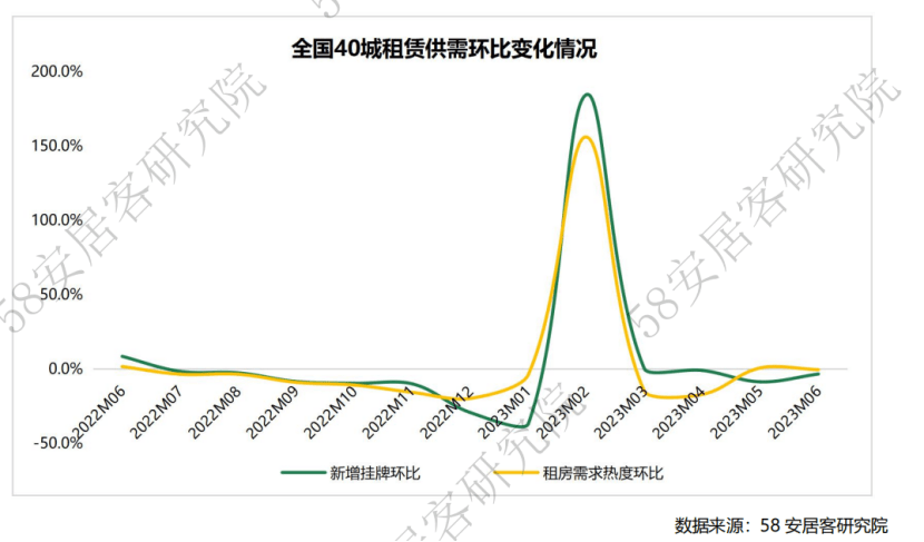 今年上半年,全国40城租赁市场供需基本处于同向波动,整体供需表现强于去年下半年。58同城、安居客《2023年上半年全国租赁市场报告》显示,2月在春节后复产复工热的带动下,租赁市场迎来供需两旺的“小阳春”行情。步入二季度后,随着市场供需在一季度的集中性释放,租赁供需趋于回落。5月和6月,租赁市场步入传统的夏季毕业求职旺季。