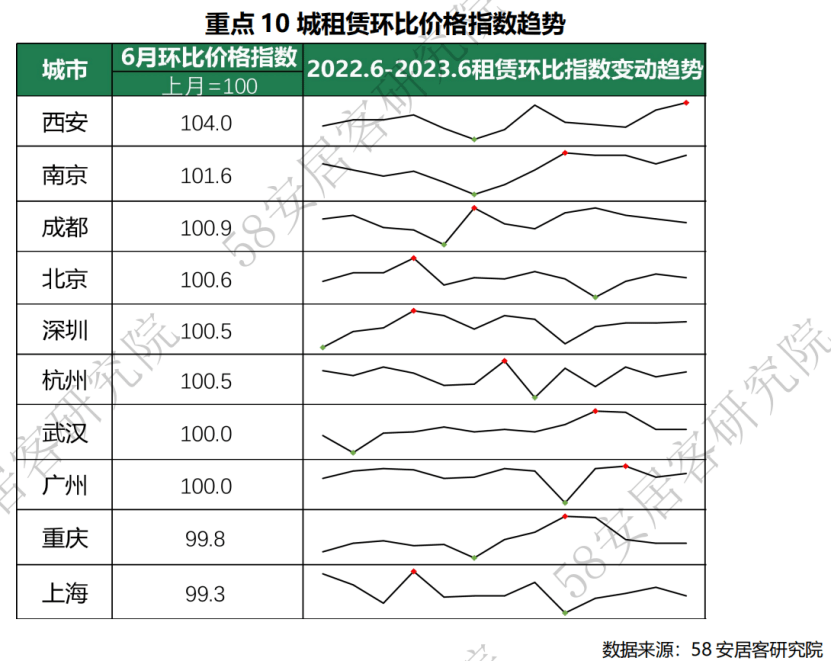今年上半年,重点10城租赁市场整体呈现出平稳复苏的态势。58同城、安居客《2023年上半年全国租赁市场报告》显示,重点二线城市的价格表现强于一线城市,部分二线城市租赁价格指数保持了较好的回升趋势,如成都、南京、武汉等城市上半年月度环比价格指数均呈现小幅温和上升的趋势。同时,步入5月夏季毕业季之后,租赁市场步入旺季,北京、深圳及西安连续两个月的环比价格指数呈现回升。