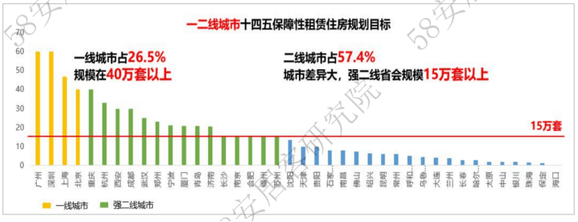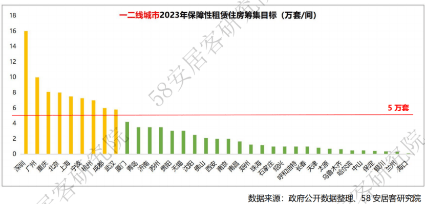 从“十四五”时期城市保障性租赁住房规划目标来看,人口规模较大的一二线城市是保障性租赁住房的供应主力区域。58同城、安居客整理数据显示,其中,一线城市在整体规划规模中占比约26.5%,二线城市占比约57.4%。同时,二线城市之间的差异较大,强二线省会城市规划规模在15万套以上。今年,一二线城市保障性租赁住房筹集量占已公布城市筹集目标总量的75.2%,核心9城2023年保障性租赁住房筹集目标超过5万套(间)。深圳、广州今年的筹集目标较高,达到10万套(间)以上。