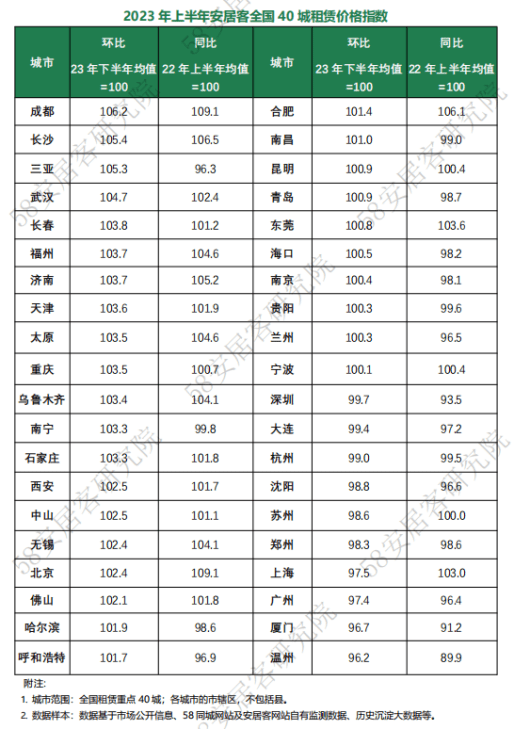 从城市价格表现来看,各城市间的分化差异显著。58同城、安居客统计显示,一线城市中,北京的租赁价格环比及同比均呈现上涨,上海、深圳和广州较去年下半年租赁价格环比均呈现小幅下跌。多数二线城市租赁价格呈现显著回升,如成都、长沙、武汉、福州、济南、太原、乌鲁木齐、合肥等城市价格表现相对较好。整体来看,2023年上半年市场普遍迎来复苏之势。