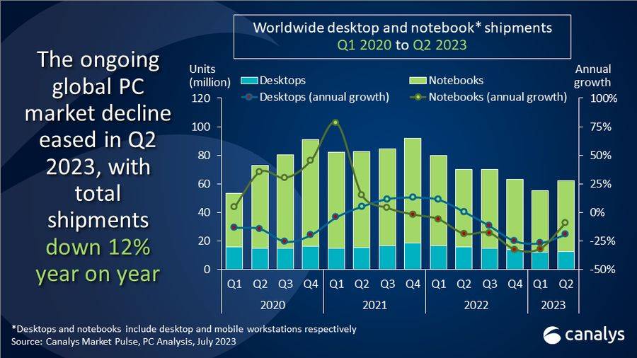 【环球网科技综合报道】7月12日消息,根据Canalys最新研究报告,2023年第二季度全球PC市场下降放缓,台式机和笔记本电脑的总出货量同比下降11.5%至6210万台。其中,笔记本电脑出货量同比下降9.3%,降至4940万台,台式机出货量下降幅度更大,下降19.3%至1260万台。此前连续两个季度出货量下降超过30%。第二季度的出货量环比增长11.9%,表明市场有望在今年下半年加速复苏。