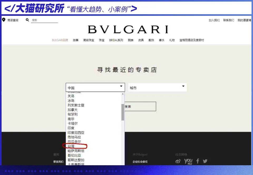 最近,又网友发现,宝格丽在其官网的店铺分布中,把台湾单独列为一个“国家”,不仅未与港澳一样加上“中国”,也未在台湾后加注“地区”,这里面的含义,昭然若揭。