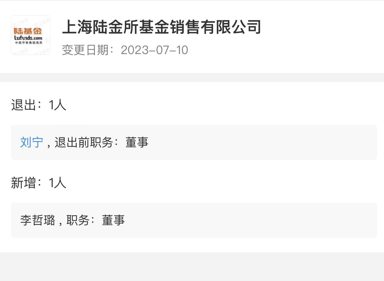 金融虎讯 7月12日消息,陆基金运营主体上海陆金所基金销售有限公司再次发生董事变更,刘宁退出,新增李哲璐为董事。据了解,今年3月,陆基金已发生过一次变更,董事郑伯松爱出,总经理陈祎彬同时接任董事。