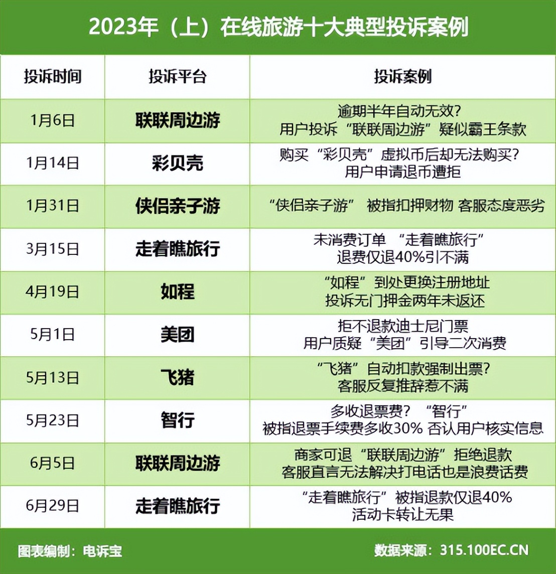 在在线旅游消费领域,我们从“电诉宝”受理用户维权案例中选取十大典型投诉案例,涉及联联周边游、彩贝壳、侠侣亲子游、走着瞧旅行、如程、美团、飞猪、智行。