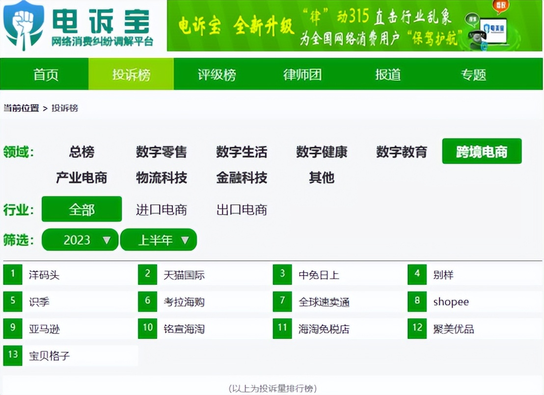 投诉量排在第1-13名依次为:洋码头、天猫国际、中免日上、别样、识季、考拉海购、全球速卖通、shopee、亚马逊、铭宣海淘、海淘免税店、聚美优品、宝贝格子。