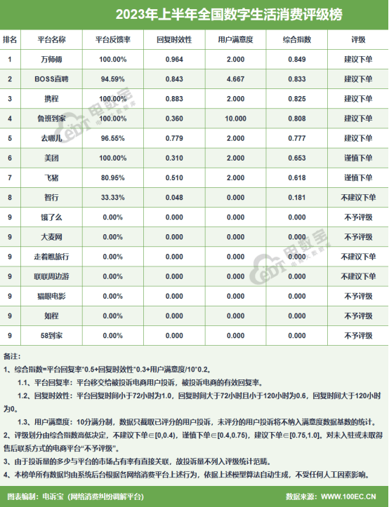在2023上半年全国数字生活评级榜中:获“建议下单”评级的有:万师傅、BOSS直聘、携程、鲁班到家、去哪儿这5家企业;获“谨慎下单”评级的有:美团、飞猪这2家企业;获“不建议下单”评级的有:智行、走着瞧旅行、联联周边游这3家企业;获“不予评级”的有:饿了么、大麦网、猫眼电影、如程、58到家这5家企业。