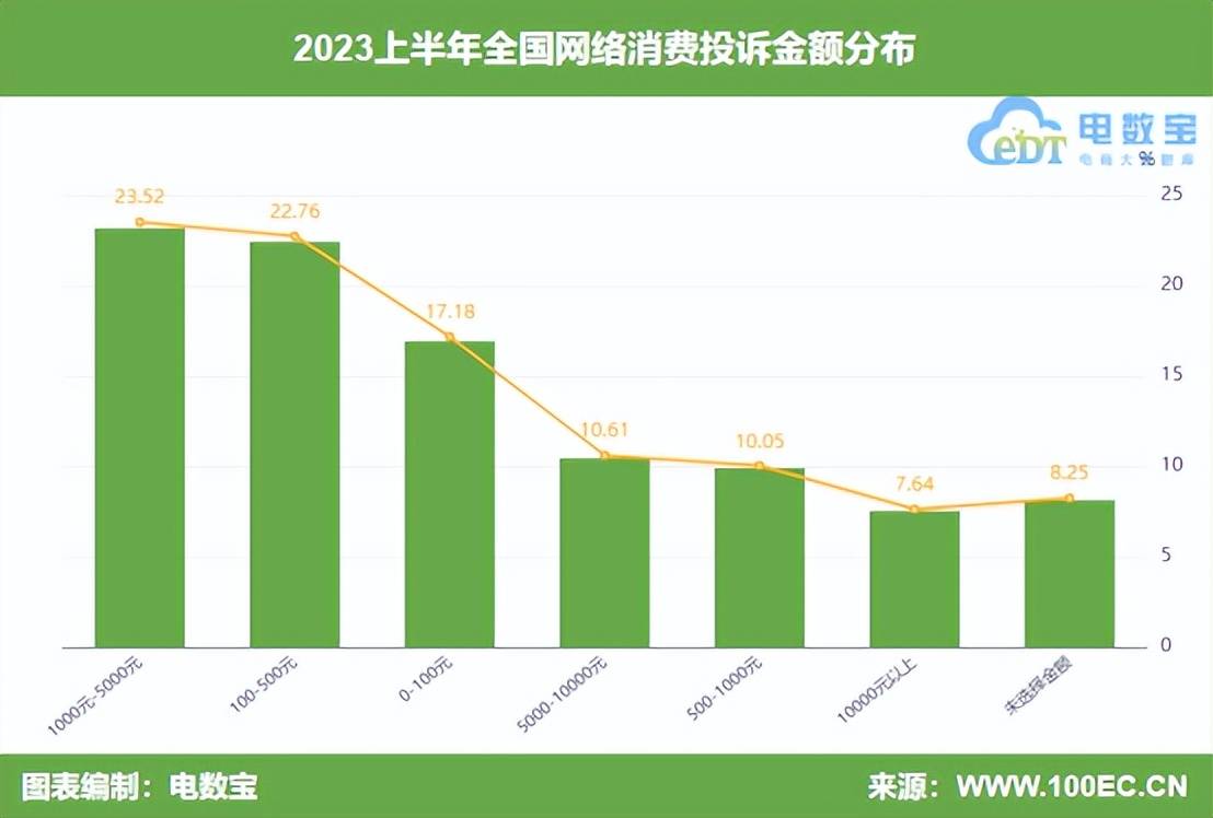 据“电诉宝”显示,2023上半年投诉金额分布主要集中在1000-5000元(23.52%)、100-500元(22.76%)、0-100元(17.18%)、5000-10000元(10.61%)、500-1000元(10.05%)、10000元以上(7.64%)、未选择金额(8.25%)。