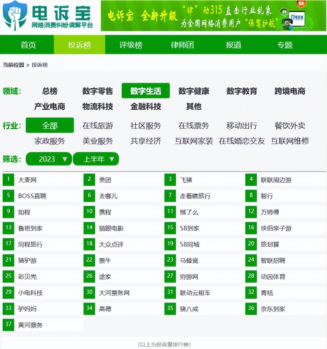 投诉量TOP10依次为:美团、飞猪、联联周边游、BOSS直聘、去哪儿、走着瞧旅行、智行、如程、携程;