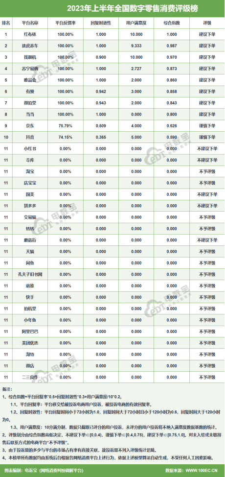 在2023上半年全国数字零售评级榜中:获“建议下单”评级的有:红布林、途虎养车、找靓机、苏宁易购、唯品会、有赞、微拍堂、当当这8家企业;获“谨慎下单”评级的有:抖音等;获“不建议下单”评级的有:小红书、寺库、国美、蘑菇街这4家企业;获“不予评级”的有:淘宝、店宝宝、交易猫、转转、天猫、闲鱼、孔夫子旧书网、萌推、快手、拍机堂、小年鱼、阿里巴巴、美团优选、淘特、微店、二三良作这16家企业。