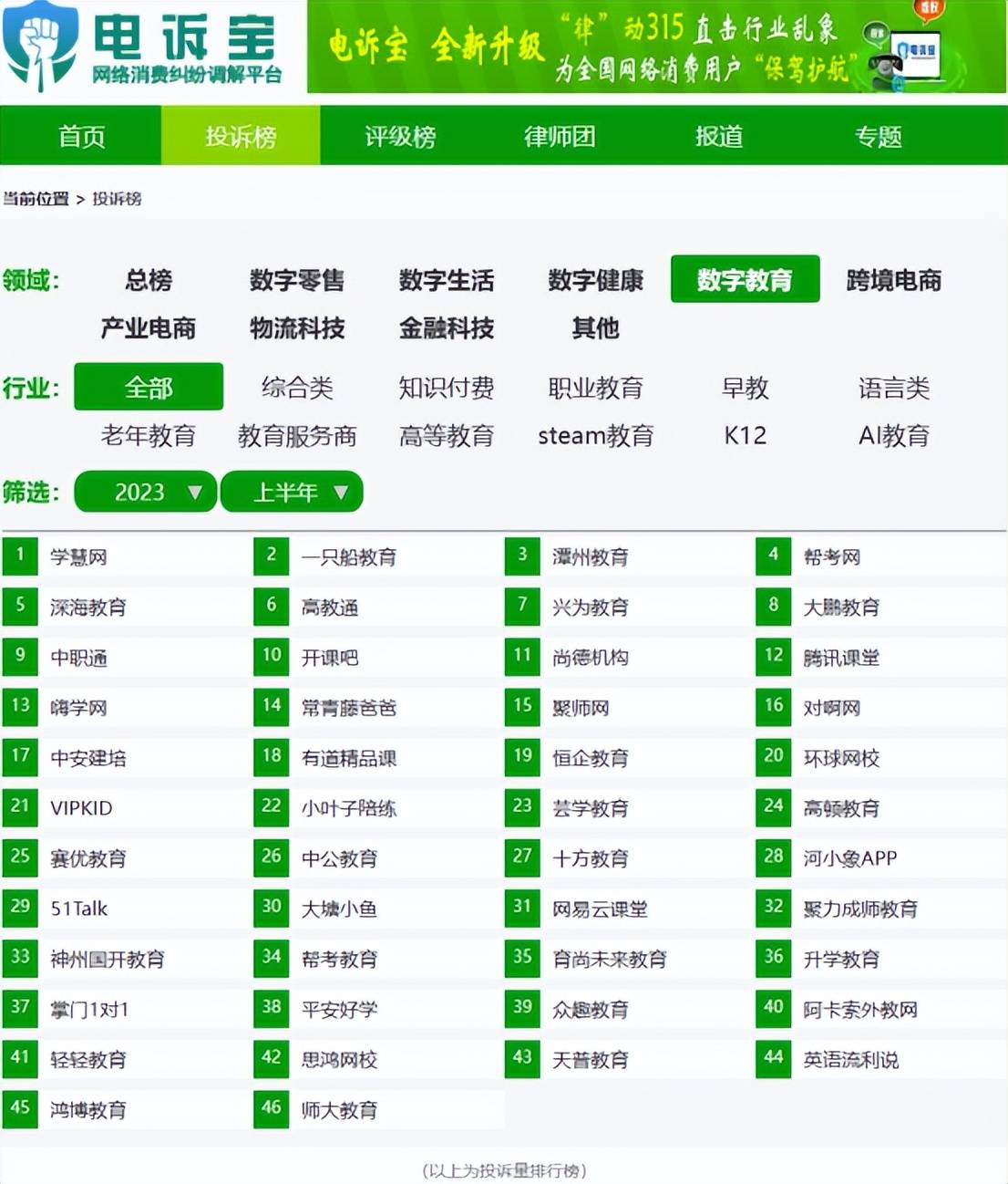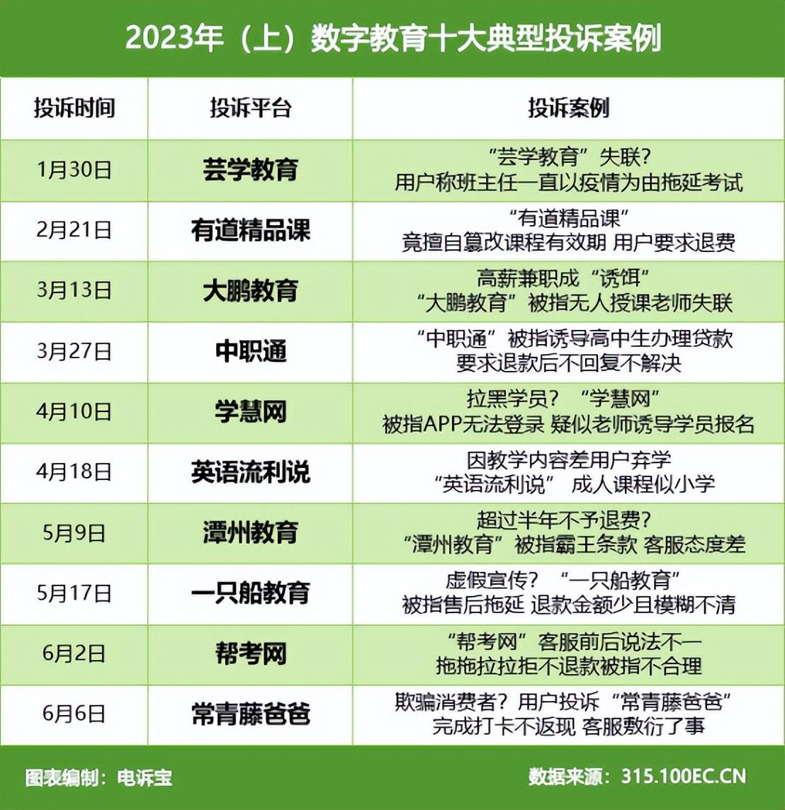 在数字教育消费领域,我们从“电诉宝”受理用户维权案例中选取十大典型投诉案例,涉及芸学教育、有道精品课、大鹏教育、中职通、学慧网、英语流利说、潭州教育、一只船教育、帮考网、常青藤爸爸。