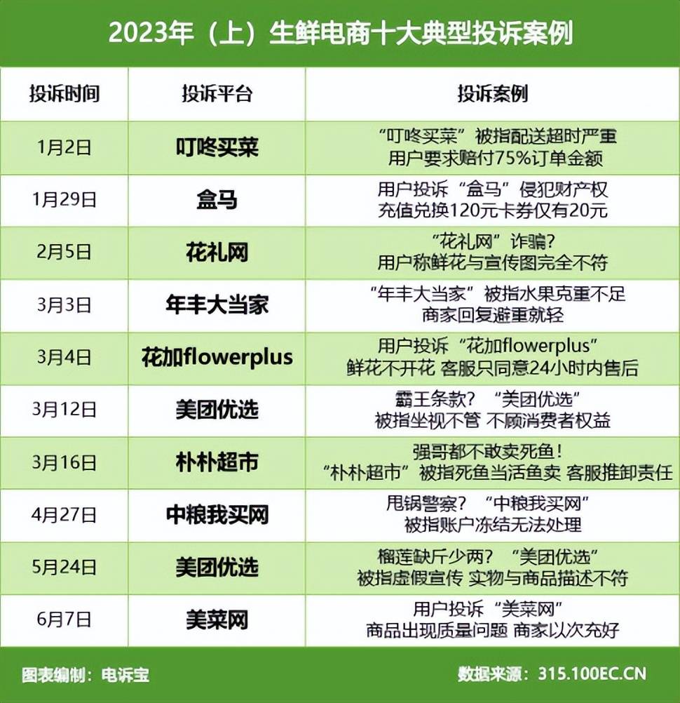 在生鲜电商消费领域,我们从“电诉宝”受理用户维权案例中选取十大典型投诉案例,涉及叮咚买菜、盒马、花礼网、年丰大当家、花加flowerplus、美团优选、朴朴超市、中粮我买网、美菜网。