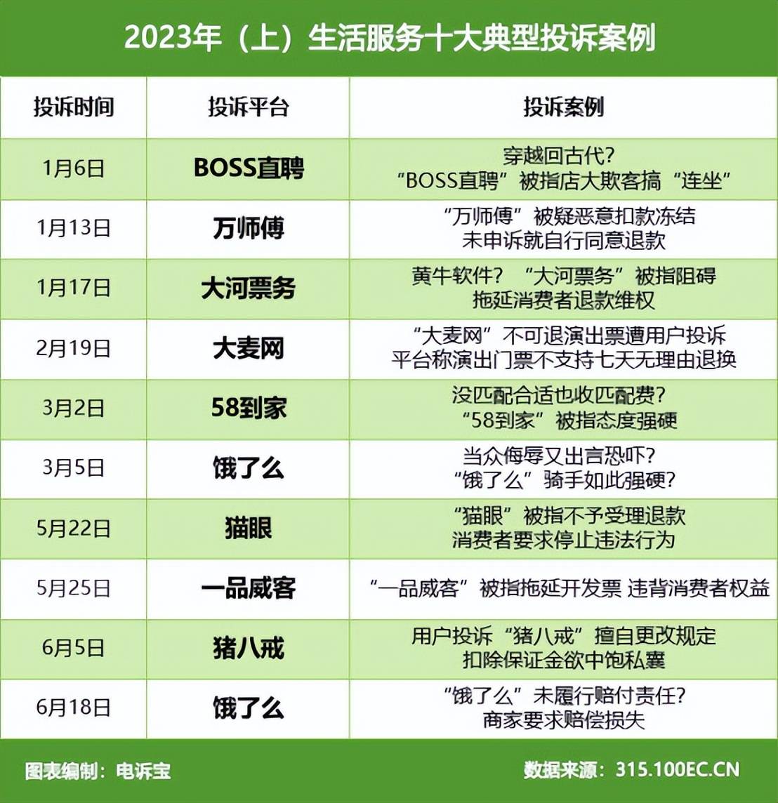 在生活服务消费领域,我们从“电诉宝”受理用户维权案例中选取十大典型投诉案例,涉及BOSS直聘、万师傅、大河票务、大麦网、58到家、饿了么、猫眼、猪八戒。