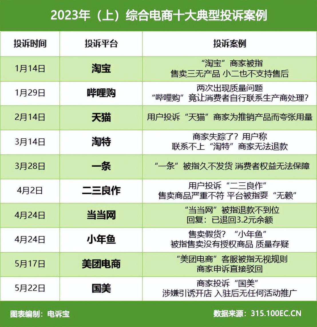 投诉量TOP10依次为:淘宝、拼多多、京东、二三良作、抖音、闲鱼、苏宁易购、快手、微店、交易猫;