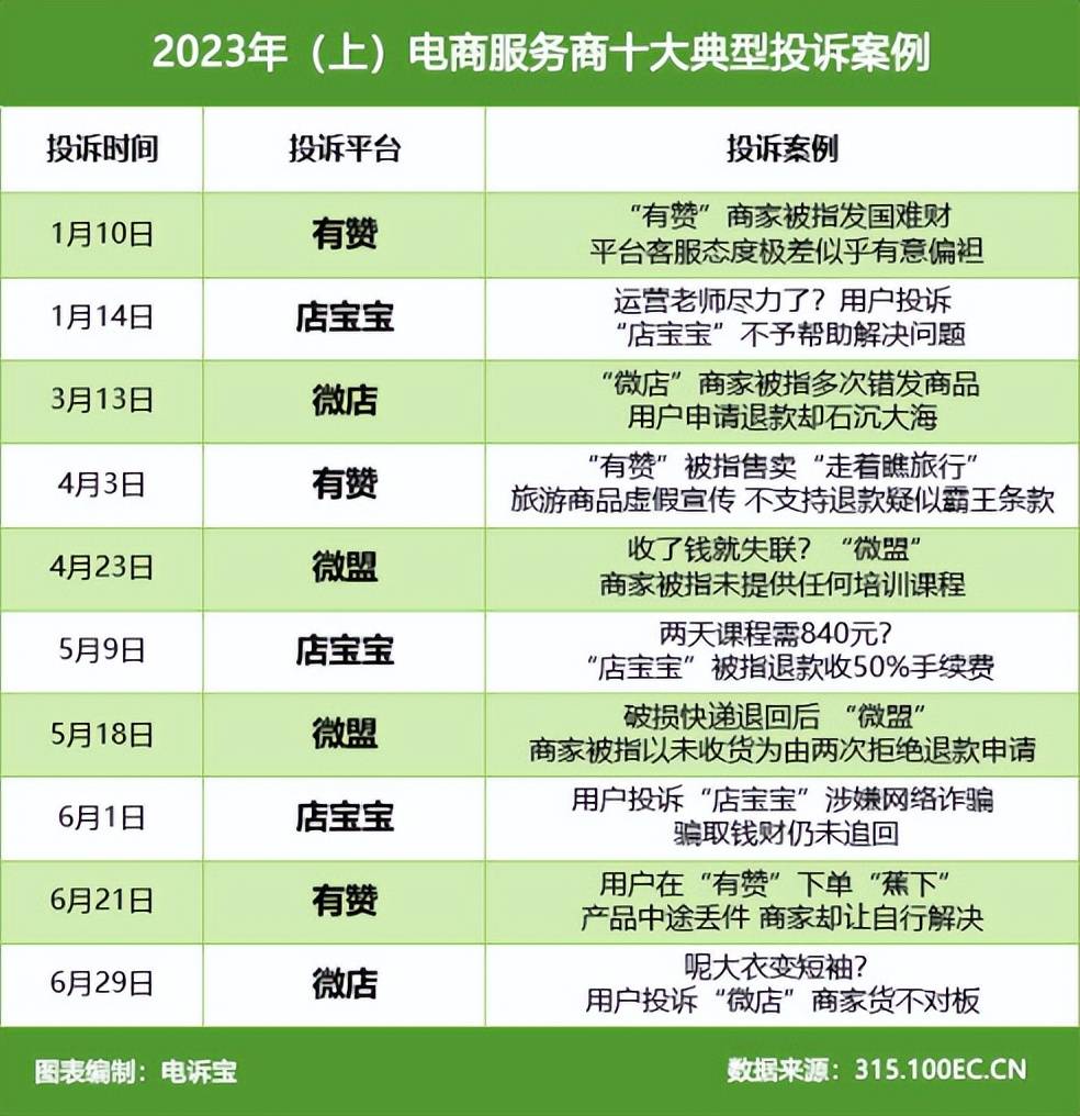 在电商服务商消费领域,我们从“电诉宝”受理用户维权案例中选取十大典型投诉案例,涉及有赞、店宝宝、微店、微盟。