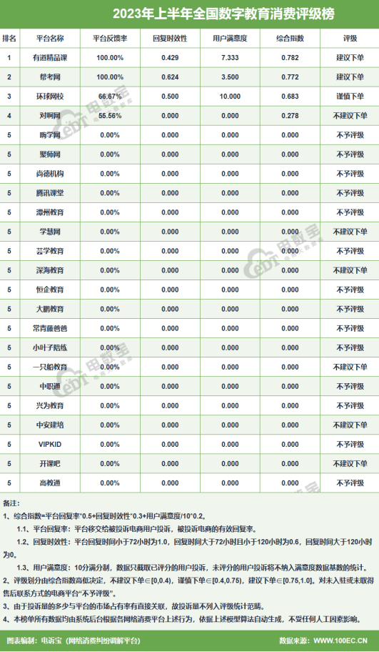 在2023上半年全国数字教育评级榜中:获“建议下单”评级的有:有道精品课、帮考网这2家企业;获“不建议下单”评级的有:对啊网、学慧网、深海教育、一只船教育、中安建培、开课吧这6家企业;获“不予评级”的有:嗨学网、聚师网、尚德机构、腾讯课堂、潭州教育、芸学教育、恒企教育、大鹏教育、常青藤爸爸、小叶子陪练、中职通、兴为教育、VIPKID、高教通这14家企业。