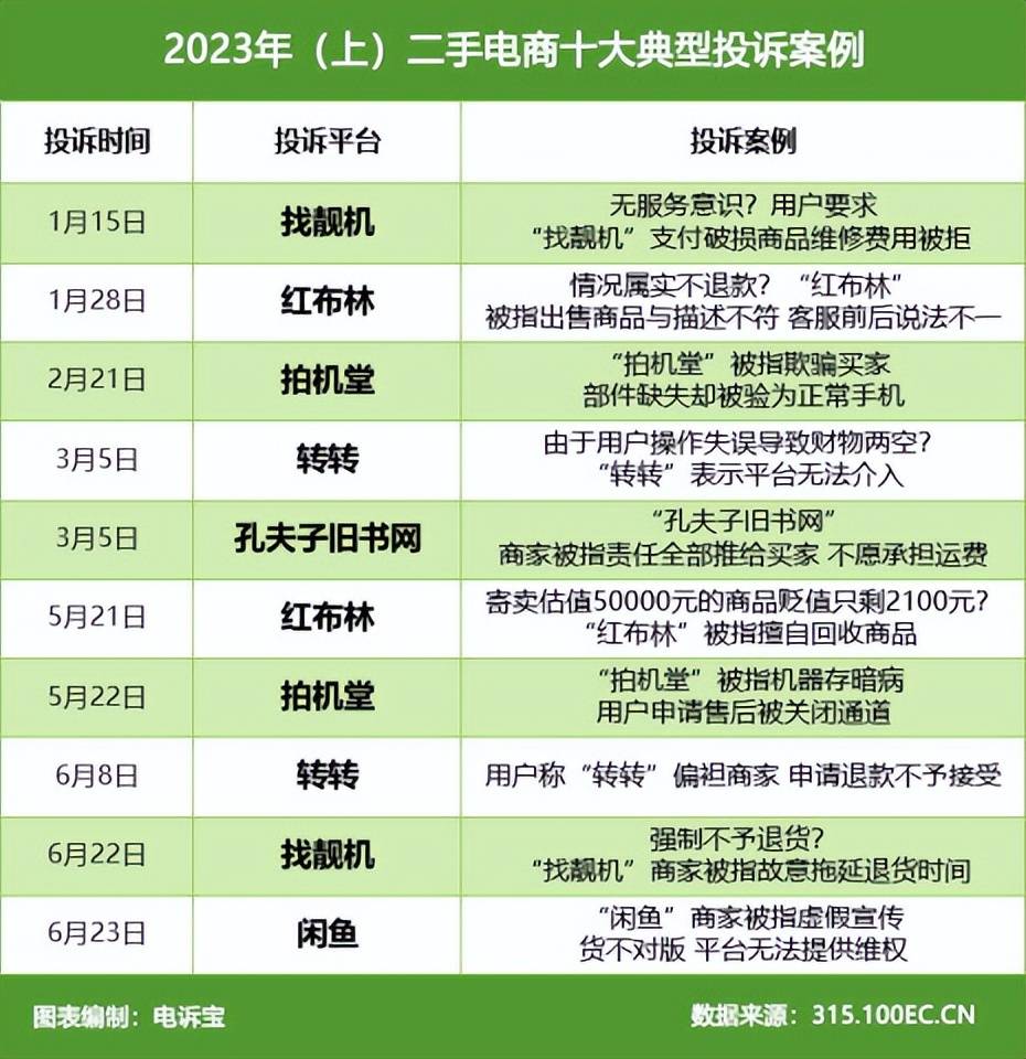 在二手电商消费领域,我们从“电诉宝”受理用户维权案例中选取十大典型投诉案例,涉及找靓机、红布林、拍机堂、转转、孔夫子旧书网、闲鱼。