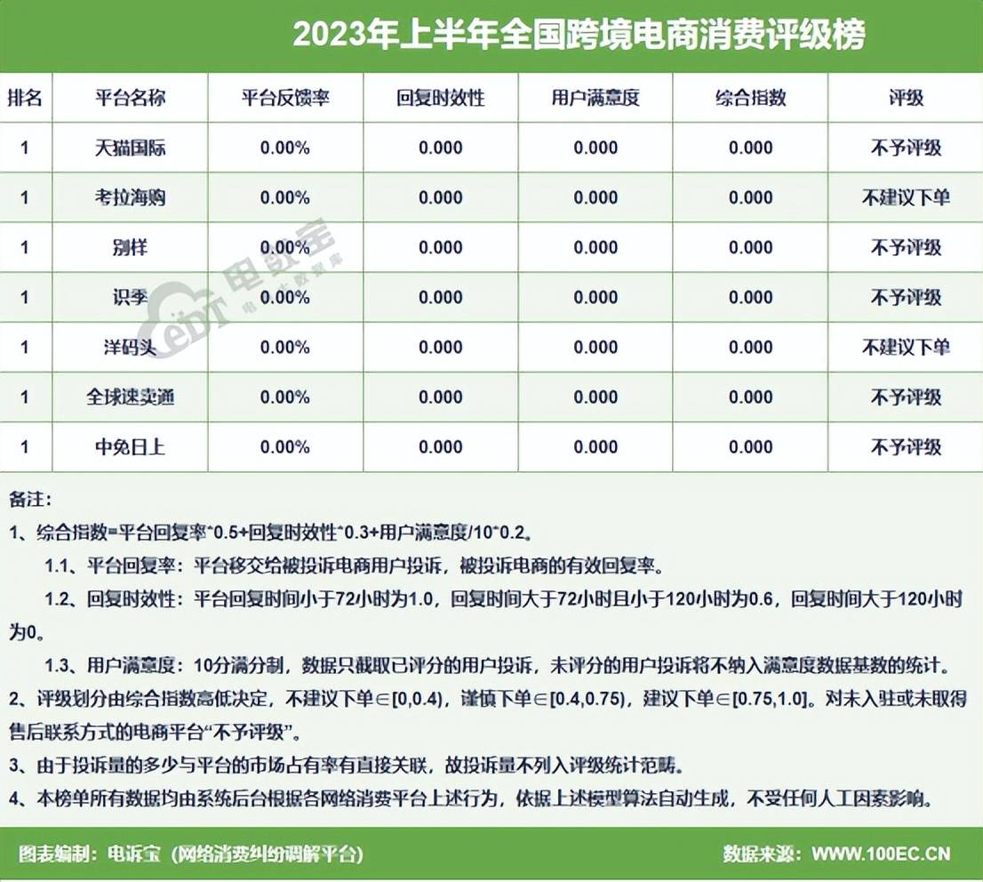在2023上半年全国跨境电商评级榜中:获“不建议下单”评级的有:考拉海购、洋码头这2家企业;获“不予评级”的有:天猫国际、别样、识季、全球速卖通、中免日上这5家企业。
