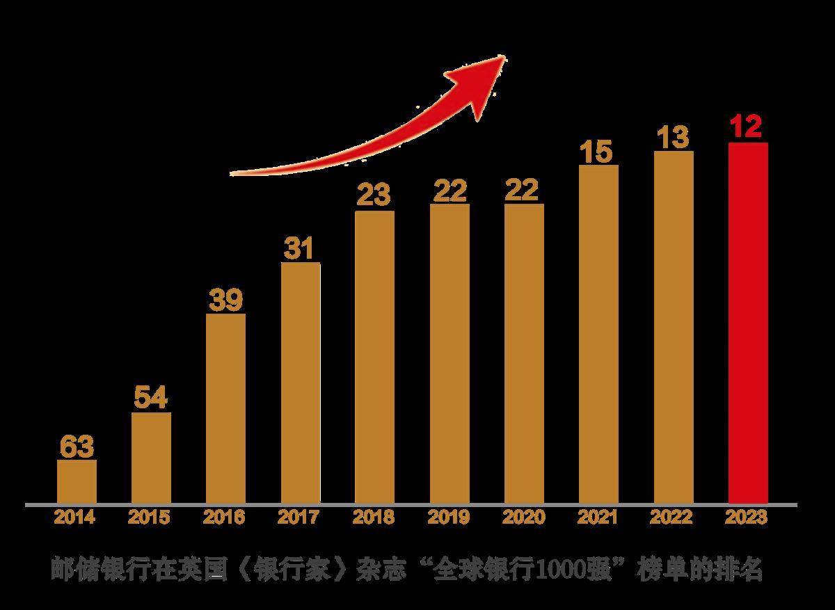 英国《银行家》杂志自1970年以来,每年发布“全球银行1000强”榜单。该排名基于一级资本等衡量银行实力的关键指标,对全球银行进行排名,从而反映全球银行业实力的变化。邮储银行2023年在“全球银行1000强”榜单中一级资本的排名,较2014年首次参加排名时的63位大幅上升51位。
