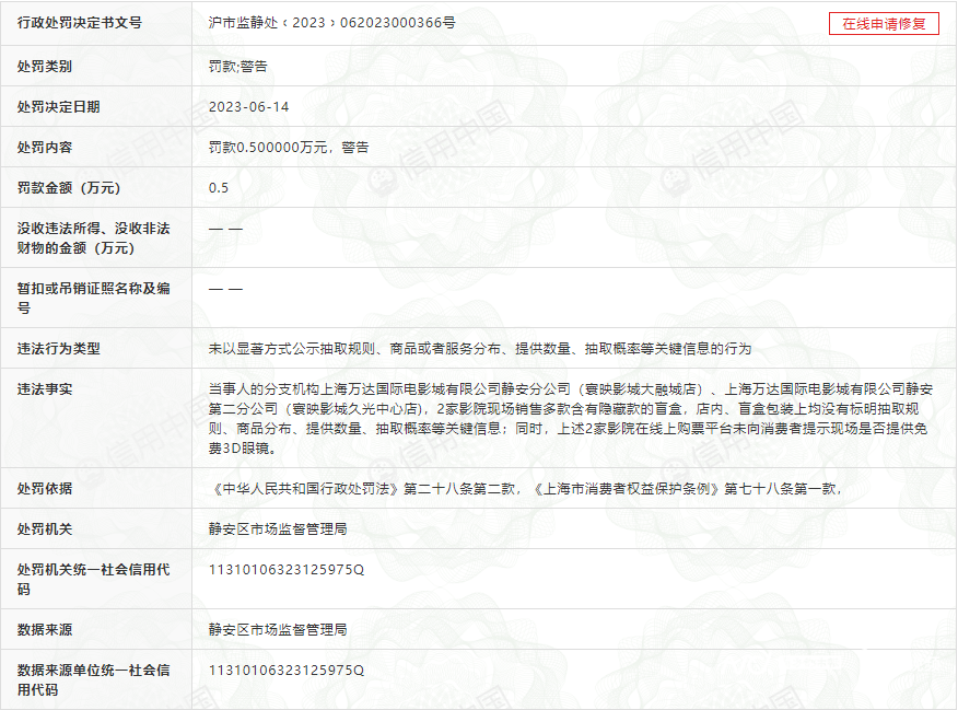 信用中国官网显示,近日,上海万达国际电影城有限公司的分支机构因涉及未以显著方式公示抽取规则、商品或者服务分布、提供数量、抽取概率等关键信息的行为,被上海市静安区市场监督管理局予以警告,并罚款5000元。