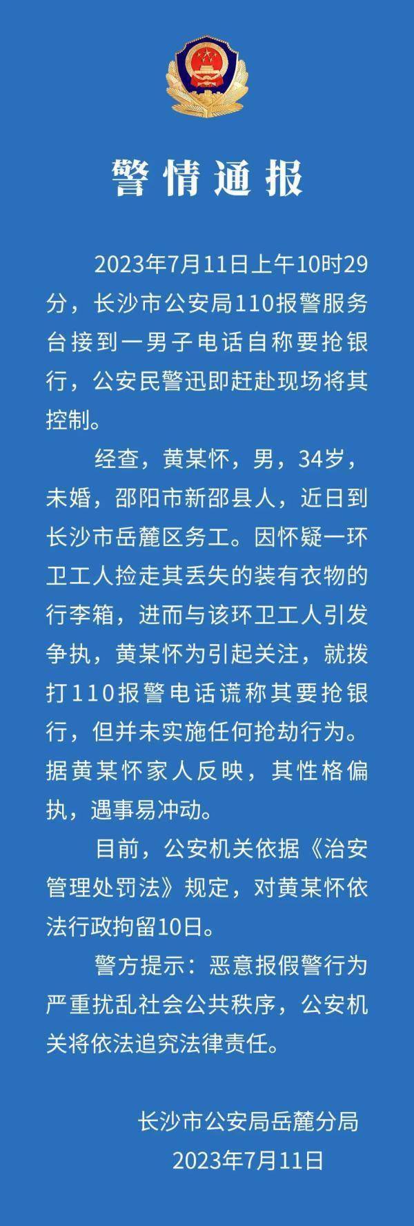 2023年7月11日上午10时29分,长沙市公安局110报警服务台接到一男子电话自称要抢银行,公安民警迅即赶赴现场将其控制。