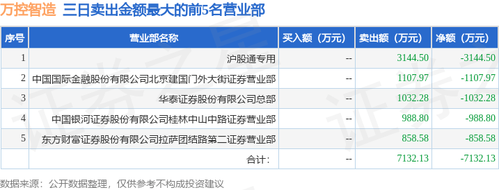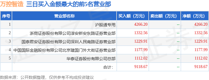 沪深交易所2023年7月12日公布的交易公开信息显示,万控智造(603070)因非ST、*ST和S证券连续三个交易日内收盘价格涨幅偏离值累计达到20%的证券登上龙虎榜。此次是近5个交易日内第3次上榜。