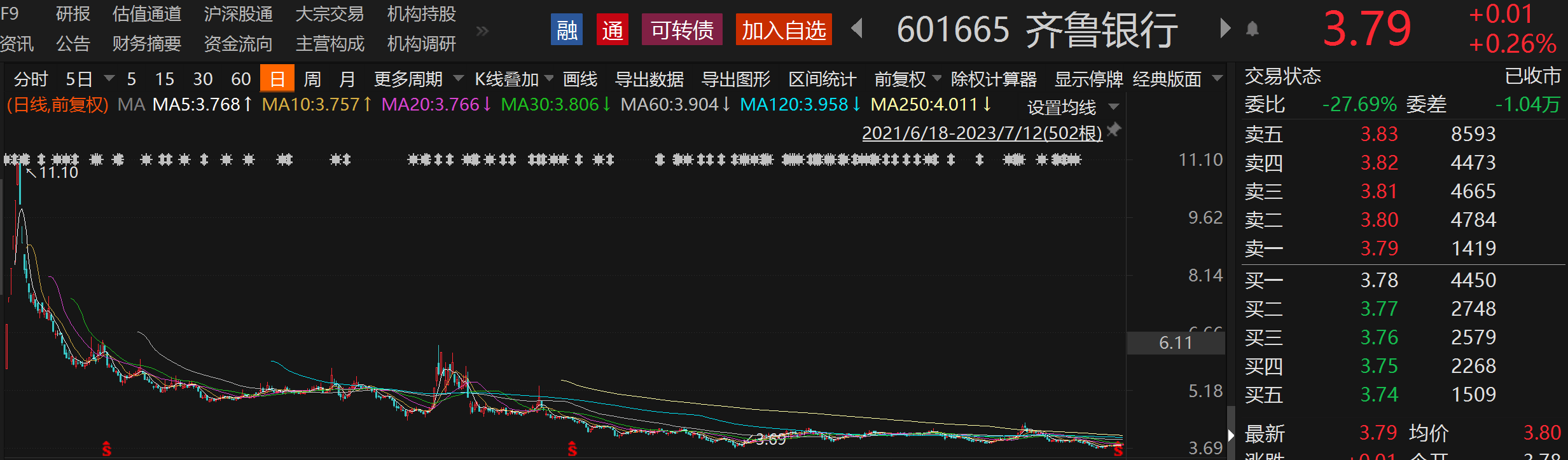 7月12日,齐鲁银行收于每股3.79元,日涨0.26%,年初至今累跌4.54%、位列板块后1/3。