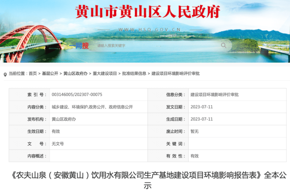 7月11日,黄山市黄山区人民政府官网发布的一份环评文件显示,农夫山泉拟在当地投资102342.2万元建设农夫山泉(安徽黄山)饮用水有限公司生产基地,形成年产160万吨饮用天然水生产能力。
