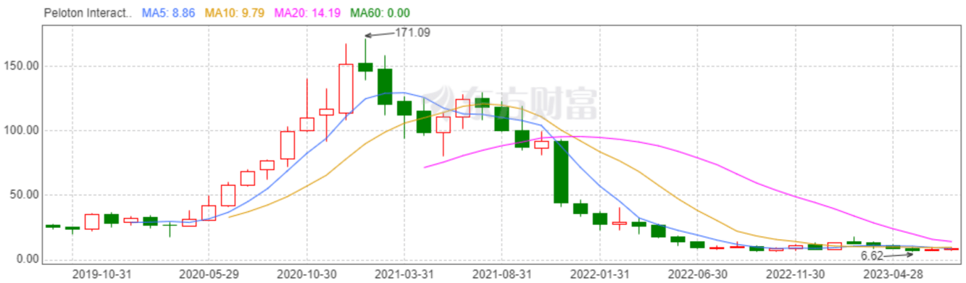 与Keep拥有相似模式的“智能健身第一股”Peloton在去年年初退出了纳斯达克100指数。Peloton靠动感单车起家,与Keep相似,都采取了“硬件+内容”的商业模式,由线上业务为硬件产品带来流量,而硬件同样也能够与软件协同。