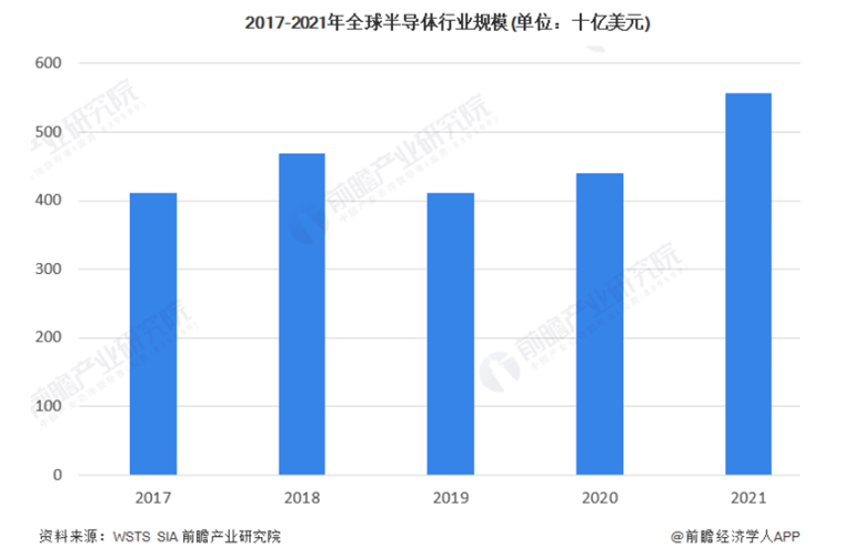 据前瞻产业研究院,2017-2021年全球半导体行业市场规模波动变化,2019年存储芯片市场下滑严重导致全球半导体市场规模出现下降,2020年以来恢复增长。根据美国半导体产业协会(SIA)发布数据,2021年达到5559亿美元,较2020年增长26%。