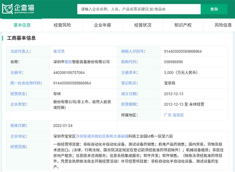 深圳市誉辰智能装备股份有限公司成立于2012年12月13日,地址位于深圳市宝安区沙井街道共和社区新和大道丽城科技工业园M栋一层至六层,法定代表人张汉洪,经营范围包括非标自动化半自动化设备、测试设备的销售;机电产品的销售;国内贸易,货物及技术进出口等。