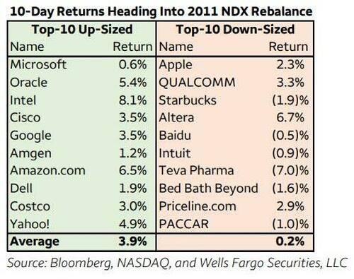 根据富国银行的统计,在2011年调权生效之前的十天内,升权最大的10只股票平均回报率为3.9%,降权最小的10只股票平均回报率为0.2%,总回报率为2.0%。
