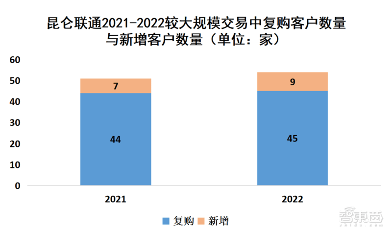 ▲昆仑联通2021-2022较大规模交易中复购客户数量与新增客户数量(单位:家)