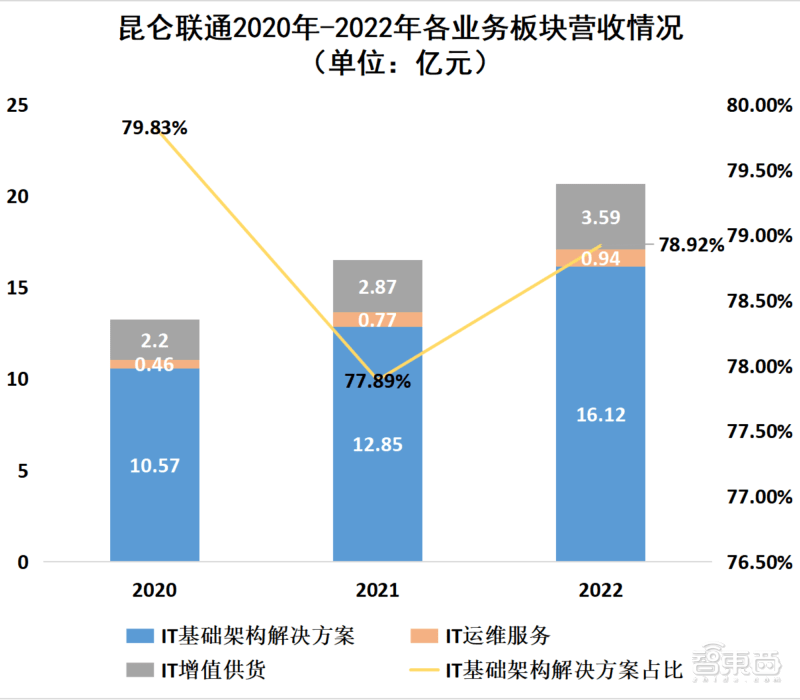 在所有业务板块中,IT基础架构解决方案营收占比最大,2020年至2022年的营收分别为10.57亿元、12.85亿元、16.12亿元,分别占总收入的79.83%、77.89%、78.92%,销售金额持续上升。