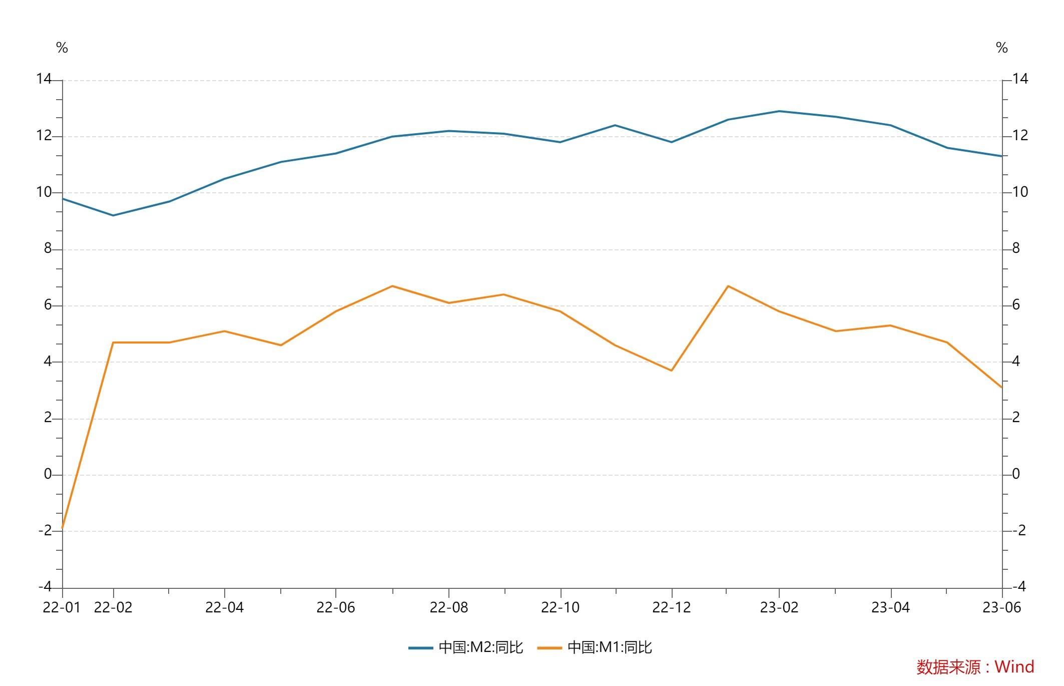 6月末,M2同比增长11.3%,增速分别比上月末和上年同期低0.3个和0.1个百分点;M1同比增长3.1%,增速分别比上月末和上年同期低1.6个和2.7个百分点。值得注意的是,截至目前,M2增速已经连续4个月下滑。2023年2月至6月,M2增速分别为12.9%、12.7%、12.4%、11.6%、11.3%。