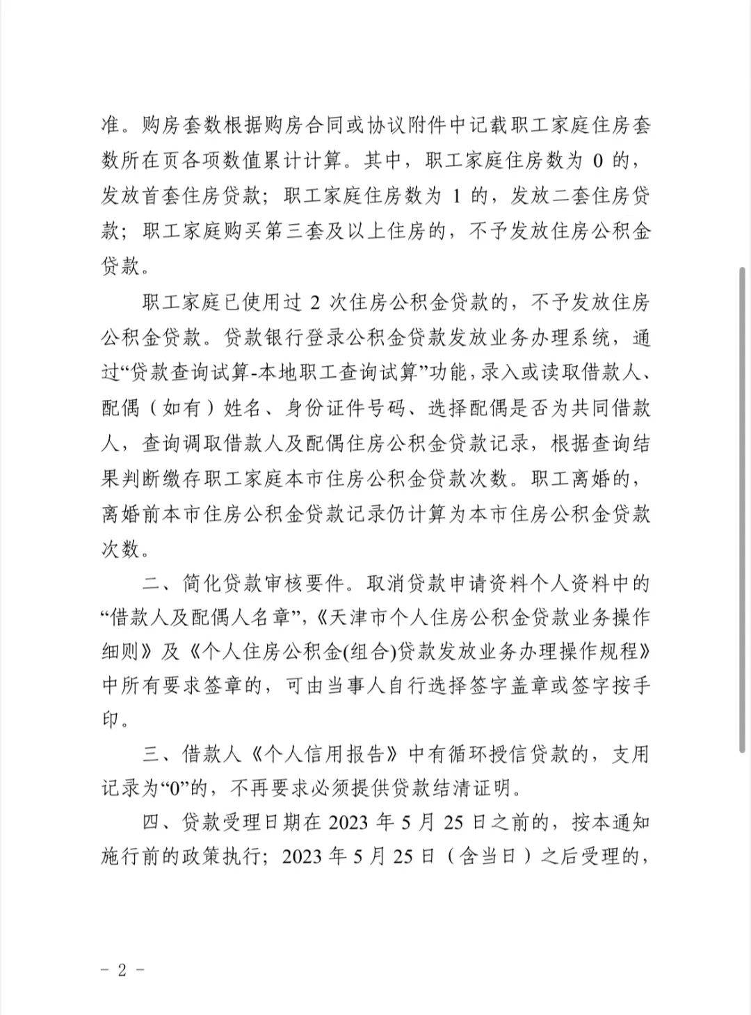 《通知》包括调整套数核定标准、简化贷款审核要件等内容。贷款受理日期在2023年5月25日之前的,按《通知》施行前的政策执行;2023年5月25日(含当日)之后受理的按《通知》执行。贷款受理日期为贷款银行向天津市住房公积金管理中心提交职工贷款申请之日。