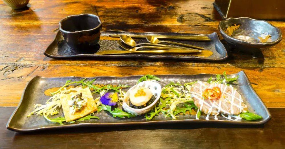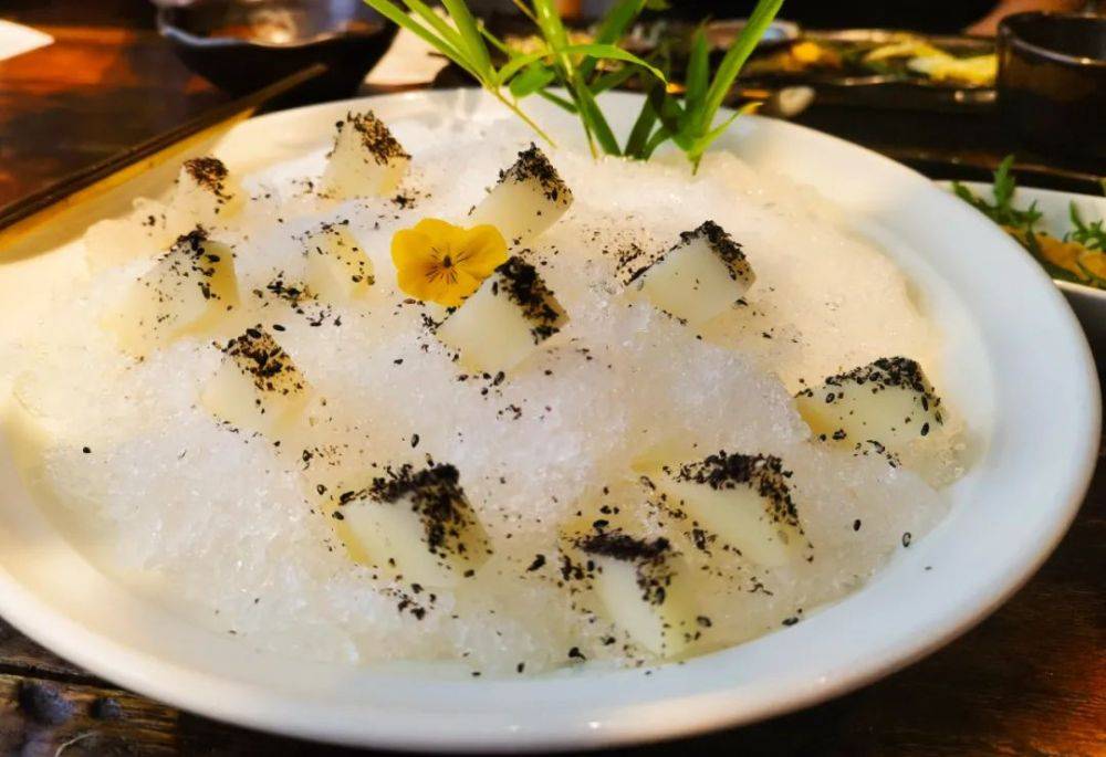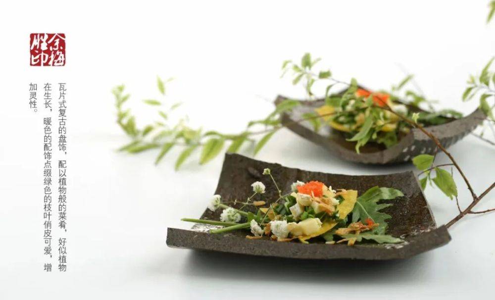 余梅胜先生的融合不仅在菜品创意,连器皿也纳入在内。他的朋友圈发出的作品照片,每道菜都搭配气质匹配的餐盘,脑洞大开至极,或中式瓦片,或小型植物生态缸,或老树虬根,都可成为创意菜的方寸容身之所。