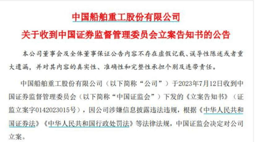 7月12日晚间,中国船舶重工股份有限公司发布公告,公司收到证监会下发的《立案告知书》,因公司涉嫌信息披露违法违规,证监会决定对公司立案。