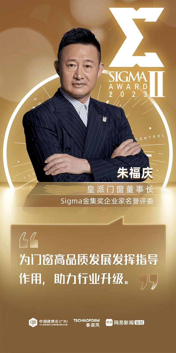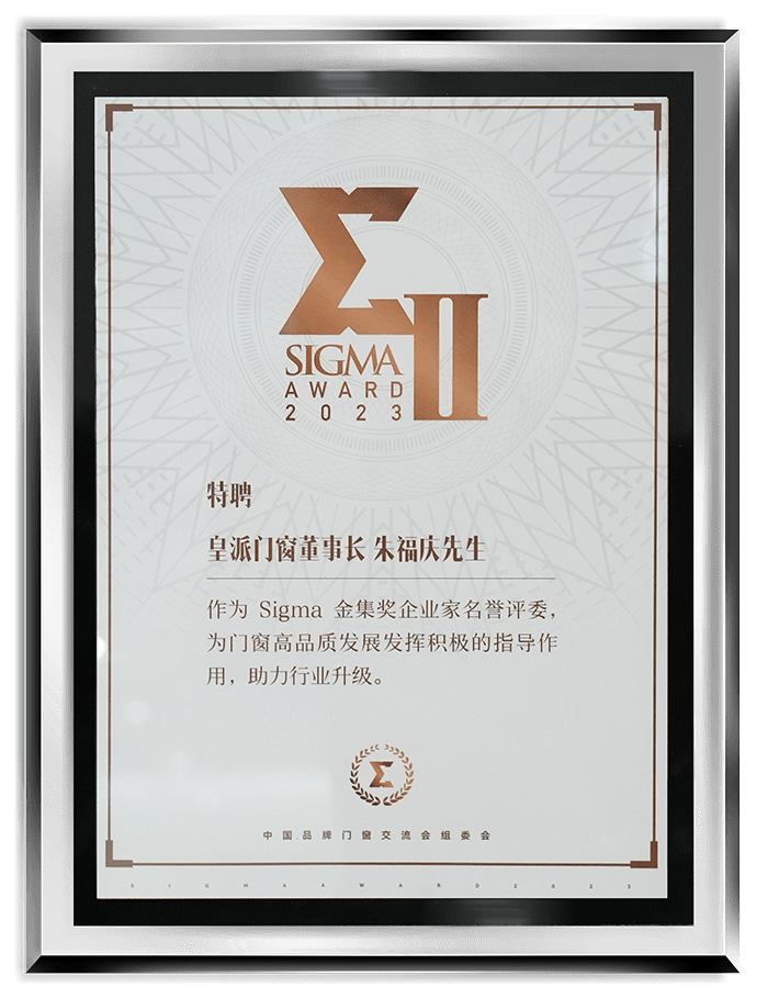 2023年7月9日,第六届中国品牌门窗交流会暨金集奖颁奖典礼盛大开启,皇派门窗董事长朱福庆荣聘为“Sigma金集奖”企业家名誉评委。
