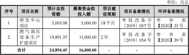 瑞星股份本次IPO拟募集资金1.60亿元,主要用于研发中心项目以及燃气调压设备生产扩建项目。
