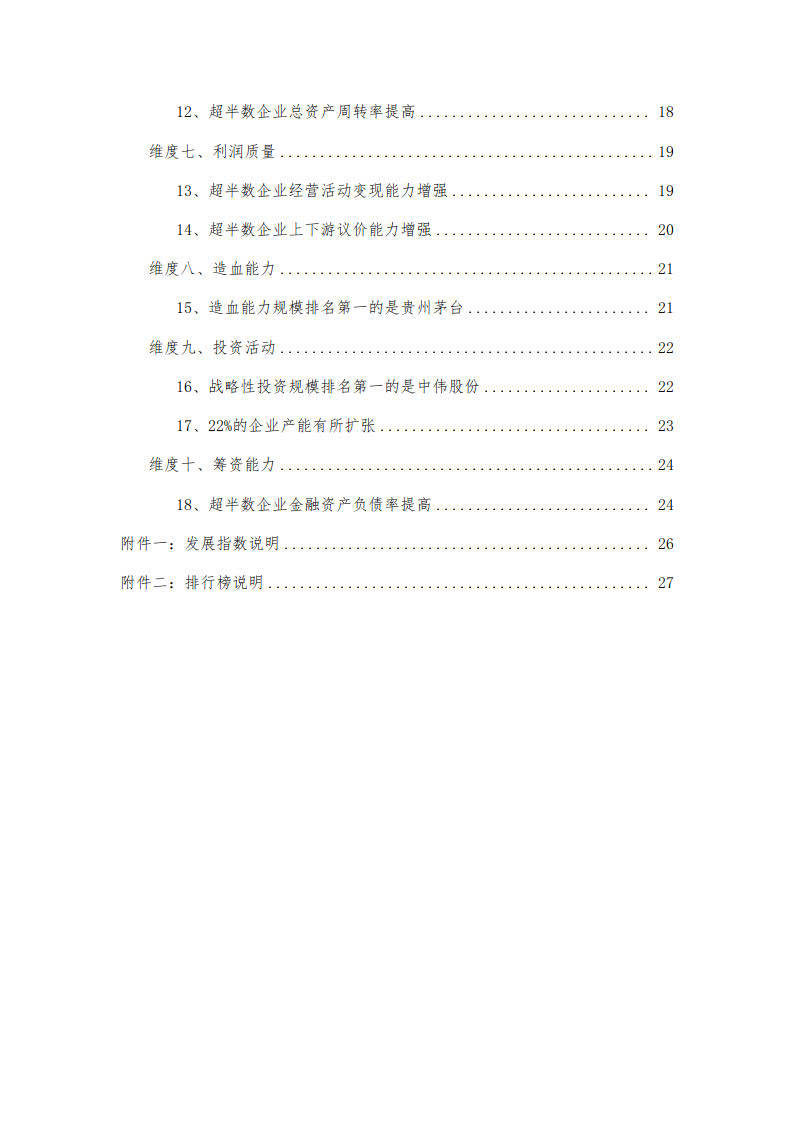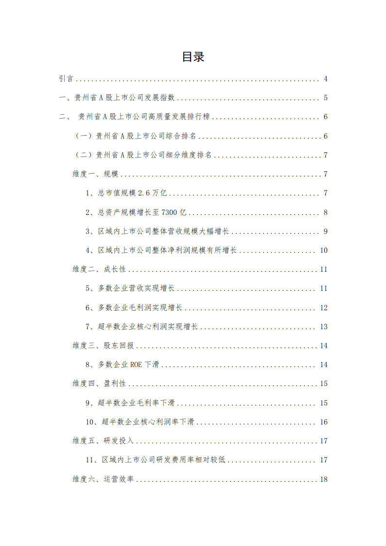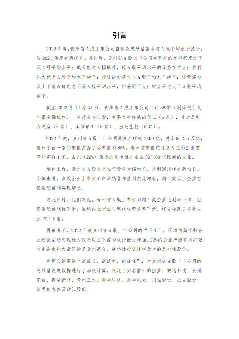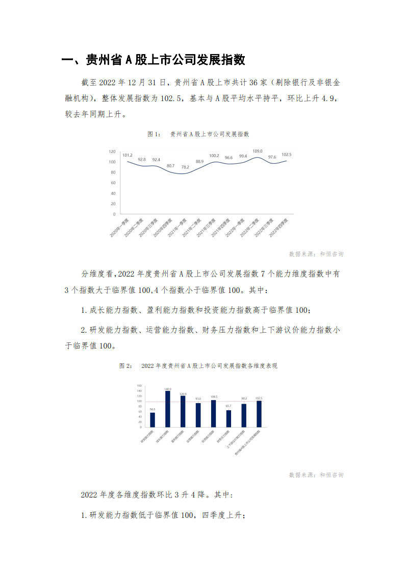 2022 年度,贵州省A 股上市公司整体发展质量基本与 A 股平均水平持平较 2021 年度有所提升。具体看,贵州省A 股上市公司对研发的重视程度远不及A 股平均水平;成长能力大幅提升,较 A股平均水平的优势在拉大;盈利能力优于A 股平均水平持平;投资能力基本与 A股平均水平持平;运营能力及上下游议价能力不及 A 股平均水平,但差距不大:财务压力大于A股平均水平。