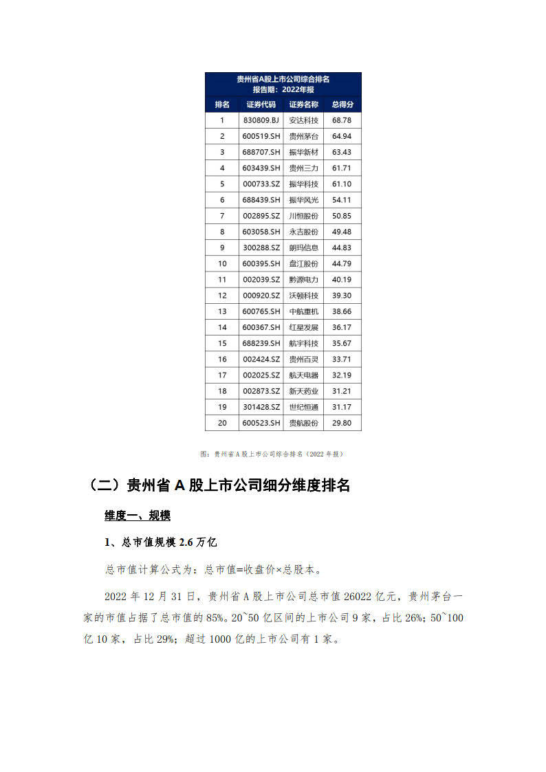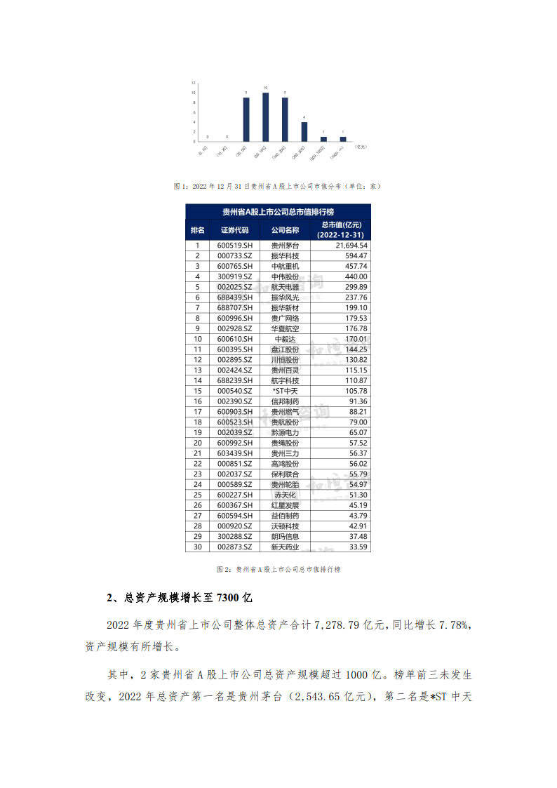 2022 年度,贵州省A股上市公司总资产规模 7300 亿,总市值 2.6万亿贵州茅台一家的市值占据了总市值的 85%。贵州省市值超过 2 万亿的企业有贵州茅台 1家,占比(29%) 最多的是市值分布在 50~100 亿区间的企业。