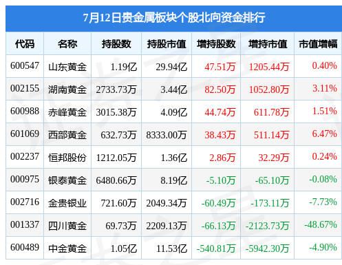 7月12日贵金属板块较上一交易日上涨0.27%,中金黄金领涨。当日上证指数报收于3196.13,下跌0.78%。深证成指报收于10919.26,下跌0.99%。贵金属板块个股涨跌见下表: