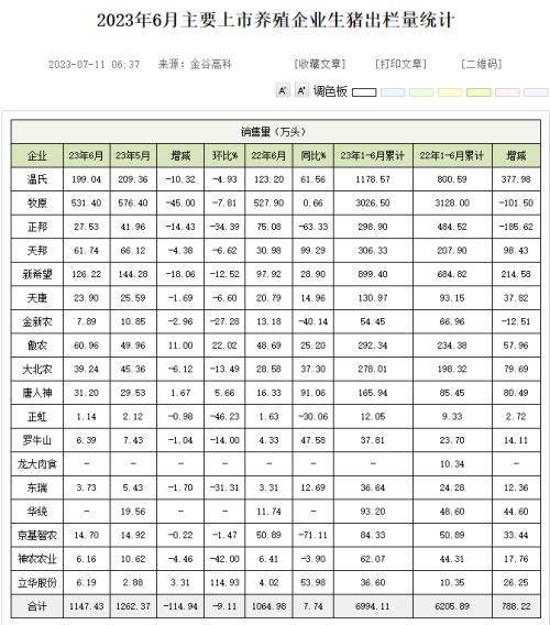 总的来看,上述18家猪企6月共出栏生猪约1147万头,环比减少约114万头,环比下降9.11%。
