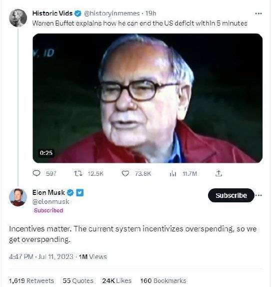 特斯拉CEO埃隆·马斯克最近对推特上一段12年前巴菲特的“考古”视频进行了回应,并指出了造成美国巨额债务问题的一个关键原因——过度支出。